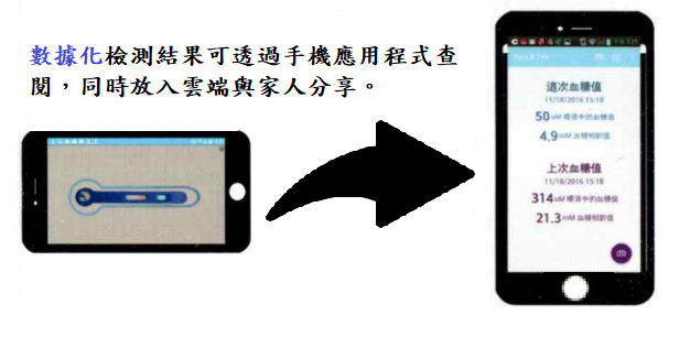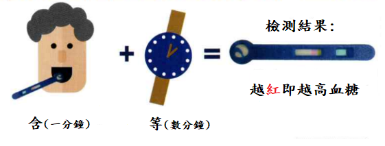 使用口水檢測→快速結果→數據化檢測結果會存入雲端→試紙上的粉紅色越深即越高血糖